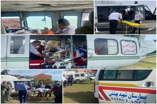 ����با توجه به وخامت حال دو تن از مصدومان، در ساعت ۱۱:۴۴ با هماهنگی انجامشده، یک سورتی پرواز اورژانس هوایی گیلان برای انتقال فوری آنان انجام شد. این دو مصدوم از بیمارستان شهید بهشتی آستارا به فرودگاه رشت منتقل و سپس توسط دو دستگاه آمبولانس اورژانس ۱۱۵ به بیمارستان تخصصی ولایت شهر رشت انتقال یافتند.